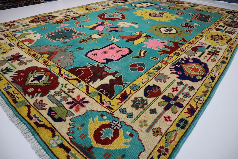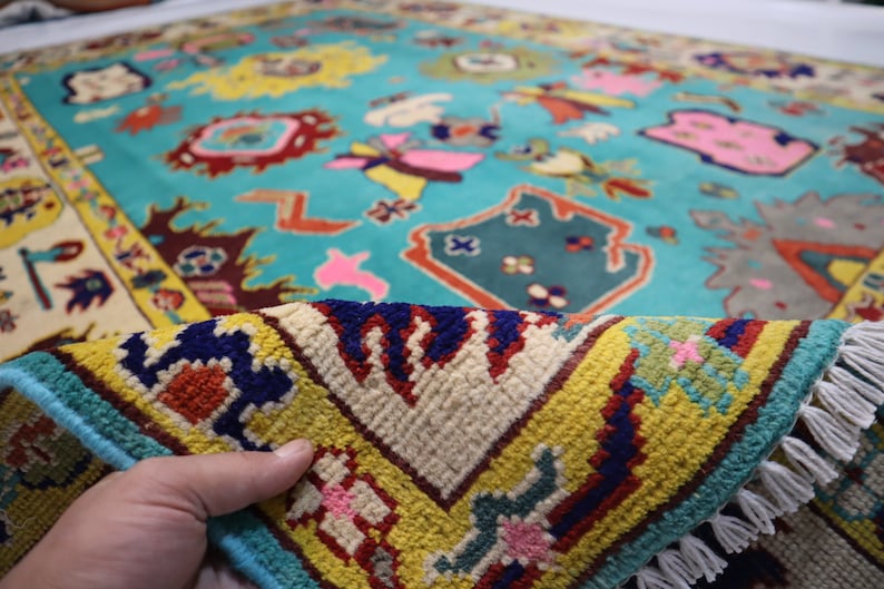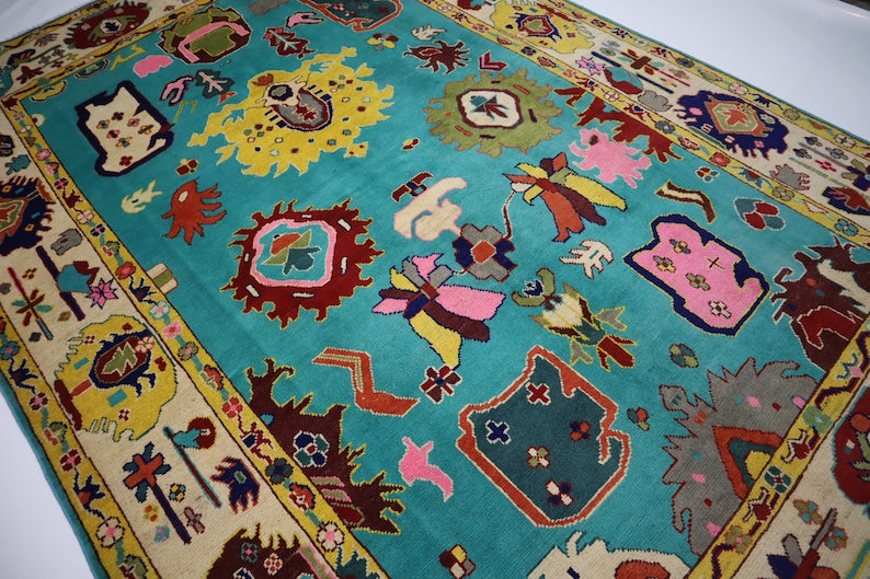 Sky Blue Turquoise Design Oushak Wool Area Rug